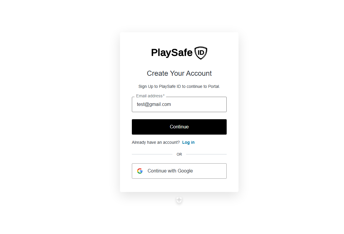 Next, enter your email address or continue with google - IMPORTANT: Make sure this is your personal email address that you have access to at all times as this will be the email address associated to your PlaySafe ID account and cannot be changed.