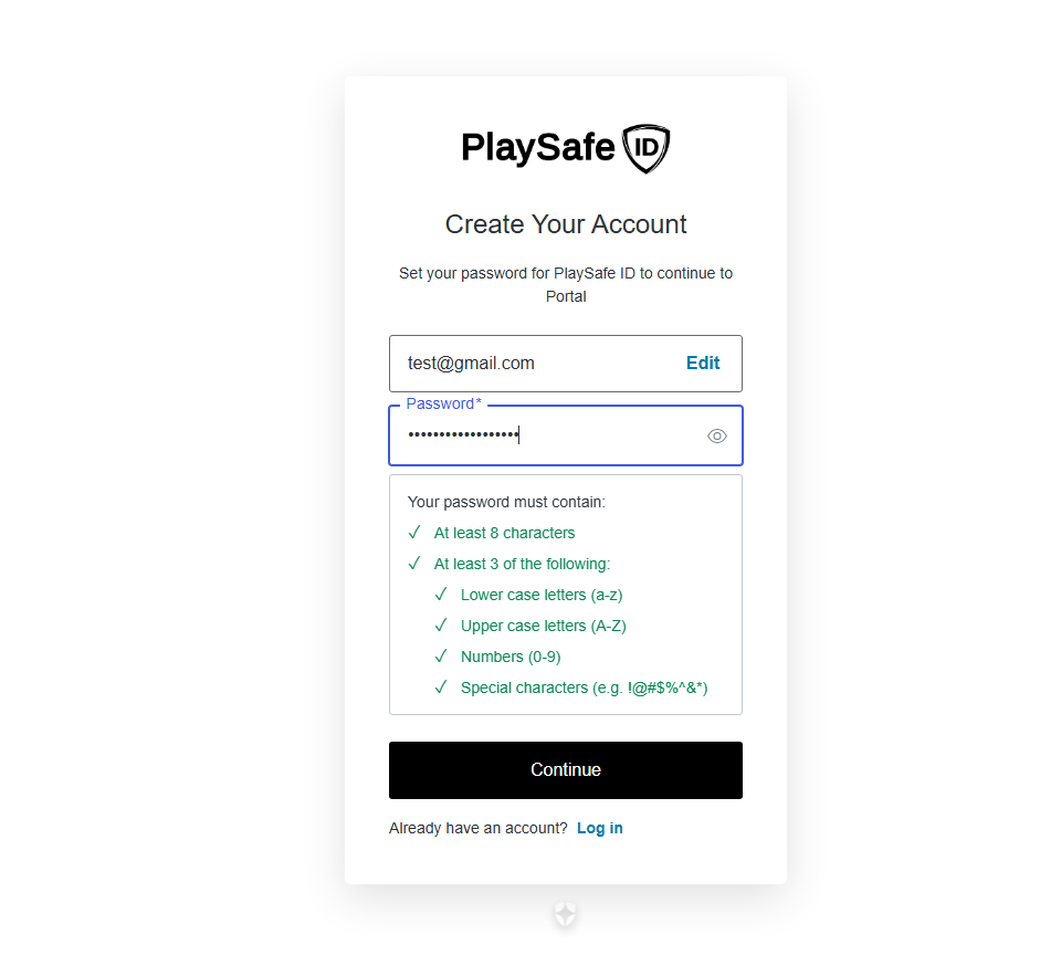 Once you have entered your email address, click "continue" to proceed. Now create your password for your PlaySafe ID account, ensuring you match the criteria. Once you are happy with your email address and password you have entered, click continue to sign up.
