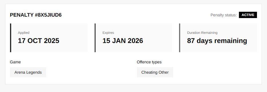 Here, you'll be able to view information about any bans / penalties you may have received. You can see the following information: